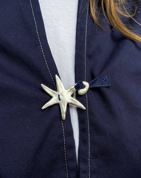 COLLAB MEOW MEOW x DËTOUR SIX* Gilet en tissu upcyclé à partir d'un tablier (par MM) et bouton en argent recyclé (par DS)* Taille 38* Pièce unique